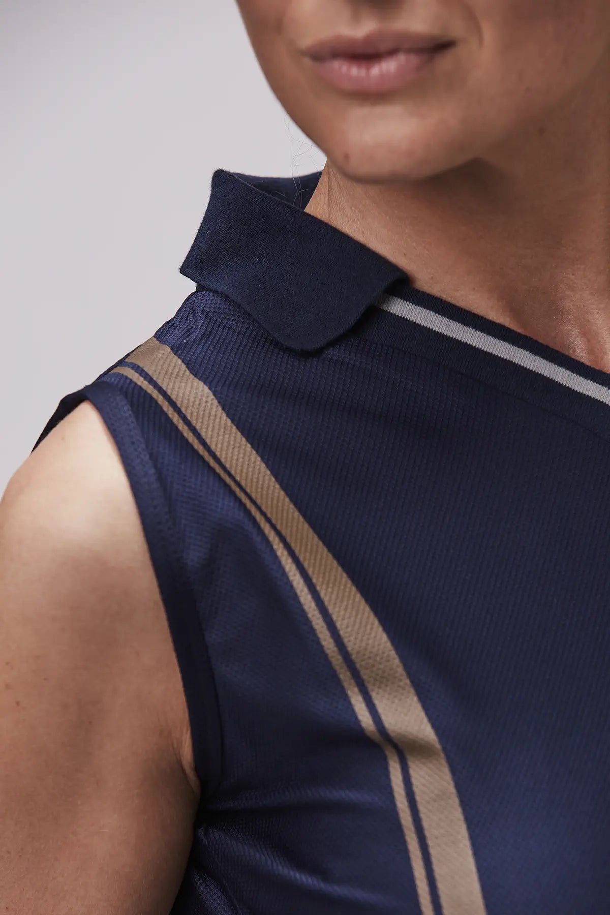 A combined collared top with a fashion/function design. The style is classic exclusive with a touch of the environment from the tennis courts of the 70s. The fabric is self-developed, very airy, sweat absorbent and with stretch.